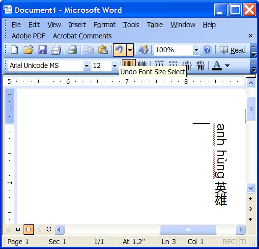 Hình B1. Gõ “anh hùng anhhùng/1” trong MS Word được cài đặt theo lối nhập thẳng đứng từ trên xuống dưới và từ phải qua trái.