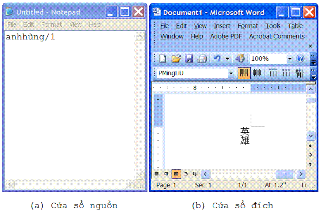 Hình B2. Gõ Hán Nôm gián tiếp: gõ chữ Việt vào một cửa sổ và chữ Hán Nôm hiện ra ở cửa sổ khác.