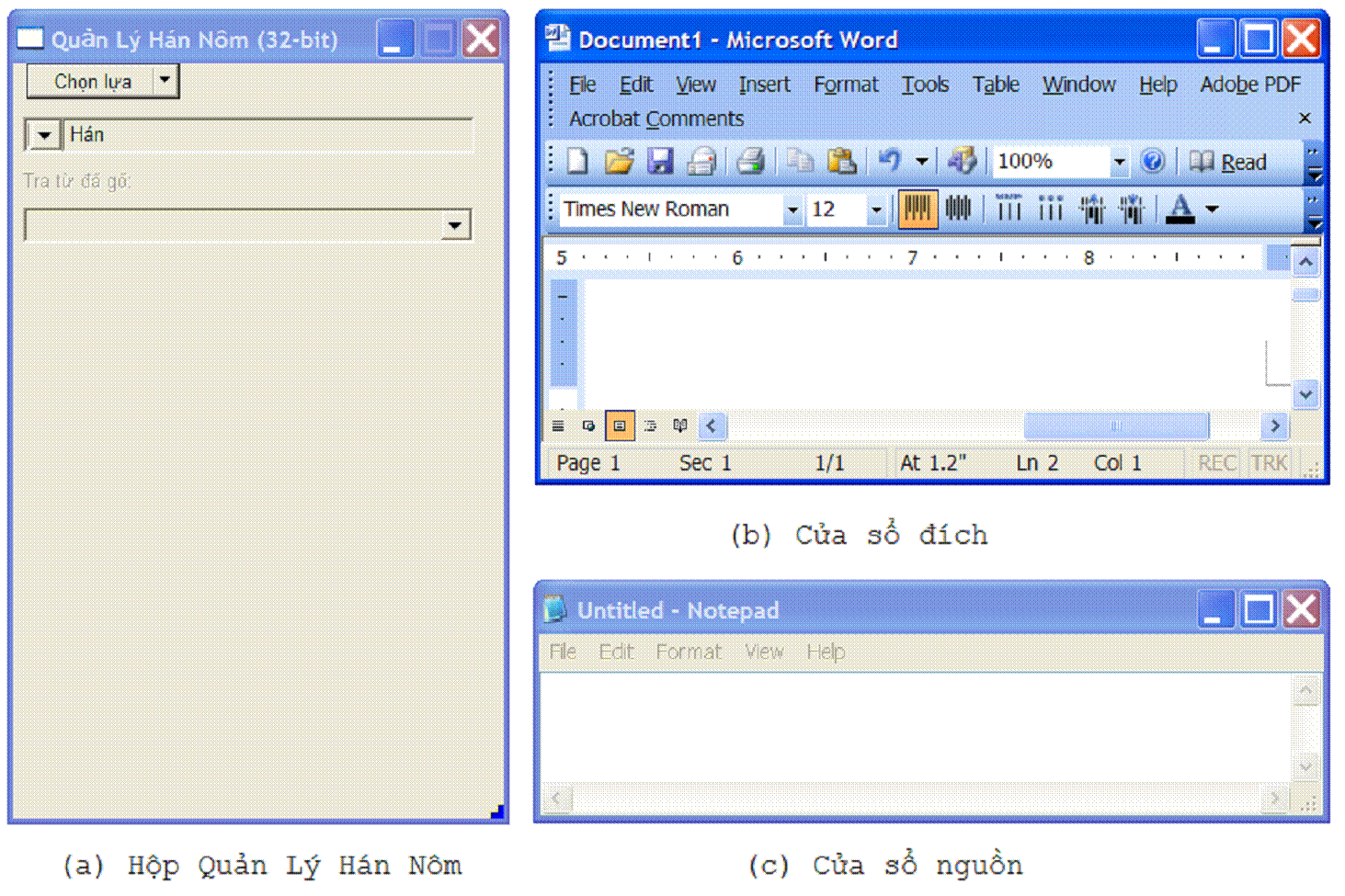 Hình B3. Bố trí các cửa sổ để gõ gián tiếp: (a) Hộp thoại Quản Lý Hán Nôm bên trái, (b) MS Word (cửa sổ đích) bên trên và (c) Notepad (cửa sổ nguồn) bên dưới.
