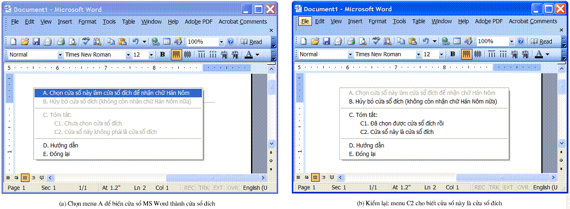 c. Để kiểm xem thực sự MS Word có phải là cửa sổ đích hay không, hãy gõ lặp lại: <SHIFT> <SHIFT> <Chuột phải>. Xong xem menu C2 như Hình B5(b) để biết trạng thái của cửa sổ MS Word .