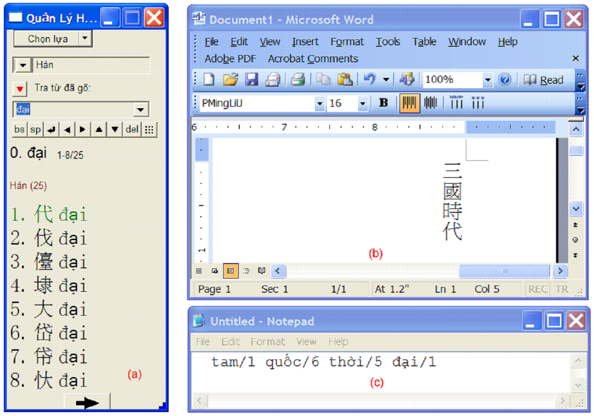 Hình B6. Gõ “tam/1 quốc/6 thời/5 đại/1” trong cửa sổ Notepad (c) thì sẽ thấy chữ Hán hiện ra trong cửa sổ đích (b).