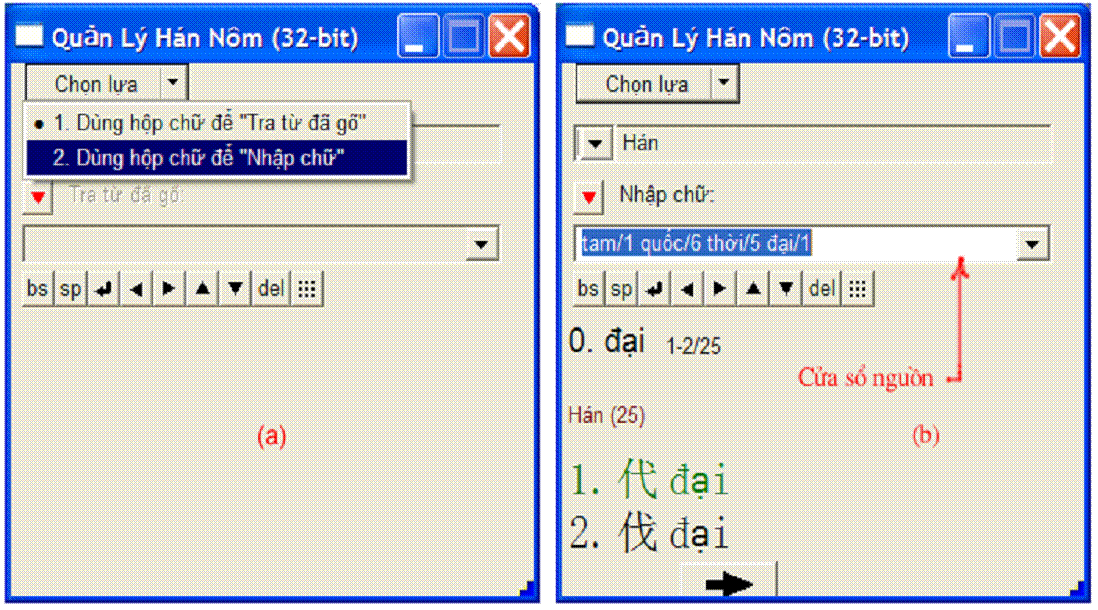 Hình B7. (a) Có thể chọn cửa sổ nguồn là ô “Tra từ đã gõ” ở hộp Quản Lý Hán Nôm bằng cách nhấn lên mũi tên màu đỏ rồi chọn menu số 2.