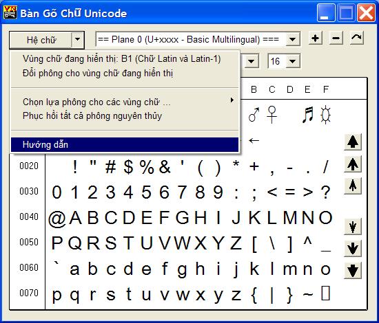 Bàn Gõ Chữ Unicode hỗ trợ tất cả khoảng 325 ngàn chữ Unicode, nhưng chỉ cho phép hiển thị từng trang một, mỗi trang có 128 chữ. Nếu biết mã số Unicode của chữ, bạn có thể nhấn nút Goto để nhảy tới trang có chữ đó. Nút Goto là nút có mũi tên cong nằm trên cùng, phía bên phải của nút dấu trừ. Nếu không biết mã số chữ nhưng lại biết ngôn ngữ của chữ đó, bạn có thể chọn đúng ngôn ngữ trong hộp combobox ở trên cùng của bàn gõ. Hoặc bạn có thể nhấn lên các nút mũi tên bên mép phải của bảng chữ để lật tới hoặc lật lui, mỗi lần có thể lật 1 trang, 8 trang, hoặc 64 trang. Khi lật đến trang không có chữ, dĩ nhiên bạn sẽ thấy trang trống. Nhưng nếu trang có chữ nhưng vì phông không hỗ trợ, bạn cần đổi phông để thấy chúng. Muốn biết thêm chi tiết, xin đọc phần Hướng dẫn (xem Hình B9).