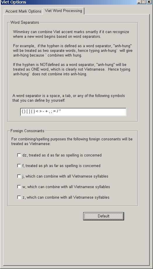 For the purpose of placing an accent mark correctly, WinVNKey needs to know where a word begins and ends. WinVNKey can rely on white spaces and some common punctuation marks, but it offers the user the flexibility of specifying their own list of word separators.
